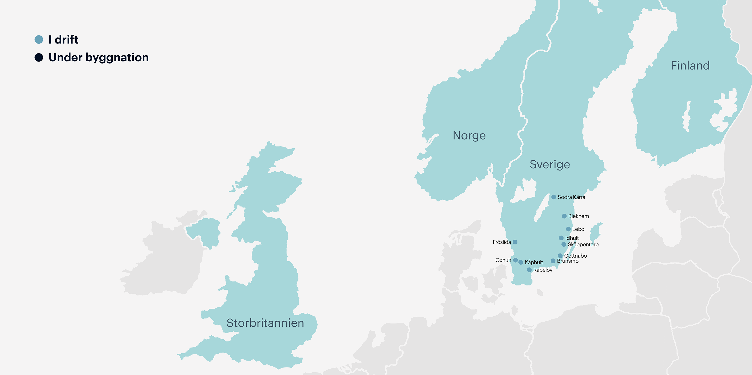Arise portfölj består av 11 helägda vindkraftparker i södra Sverige, som årligen producerar cirka 430 GWh. Vindkraftparkerna är lokaliserade i prisområdena SE3 och SE4, vilket typiskt sett är Sveriges högprisområden. Denna geografiska placering innebär även ytterligare fördelar, bland annat minimeras störningar till följd av de naturliga barriärer som skogen utgör vilket innebär minskat buller, skuggeffekter och visuell påverkan.